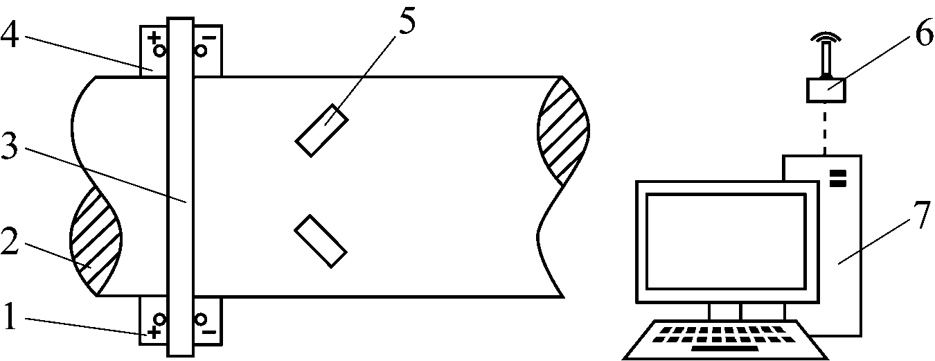 1-电源模块;2-转轴;3-胶带;4-采集模块;5-应变片; 6-无线网卡;7-主控上位机
