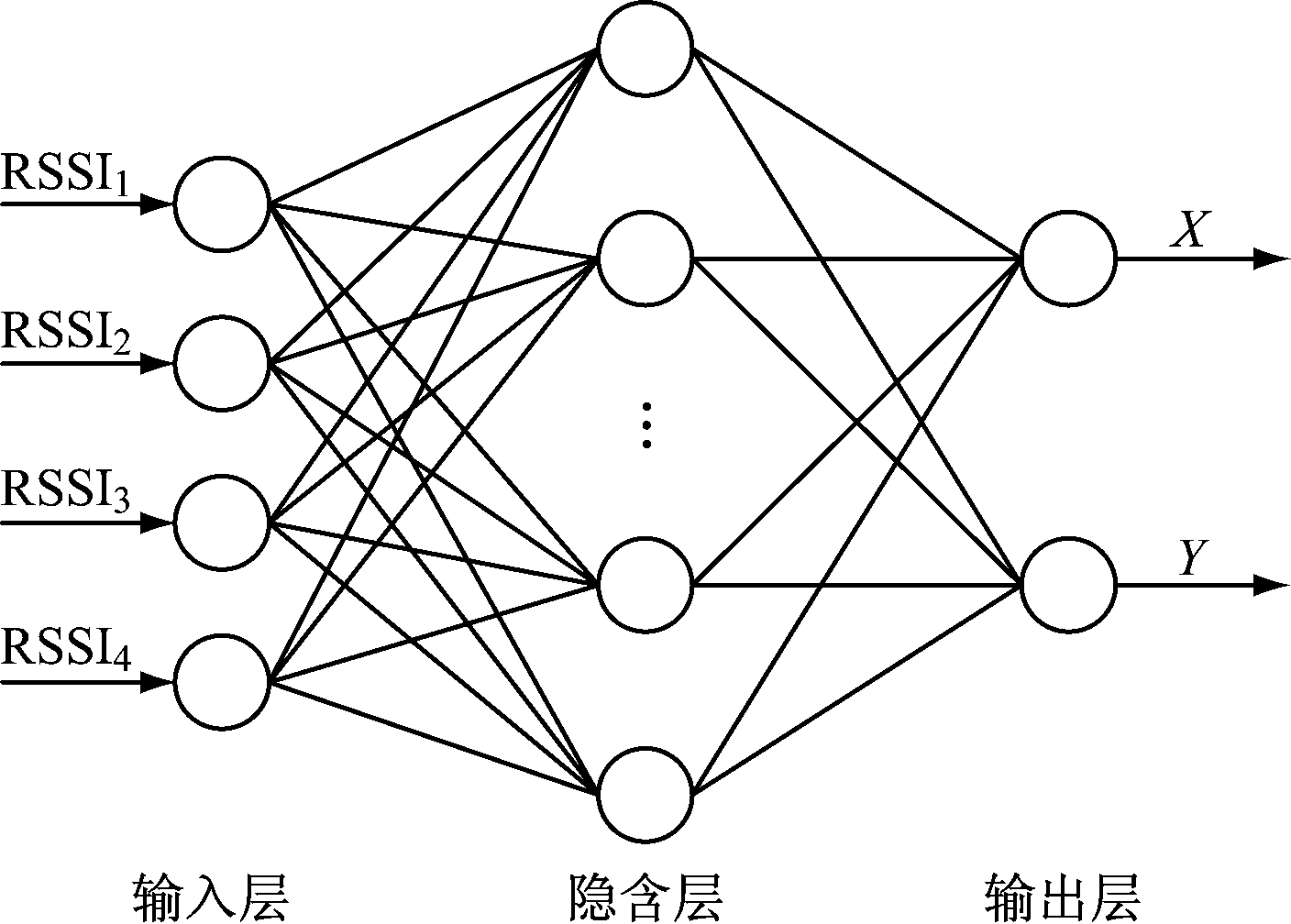 为了减少煤矿安全事故的发生,需要一种实时准确的煤矿井下人员定位保障系统。煤矿井下巷道空间狭小,作业噪声严重,普通的室内外定位方式无法满足要求。随着传感技术、计算机网络技术、无线通信技术的不断发展,WSN(Wireless Sensor Network,无线传感器网络)被应用到各个领域。WSN自组织性强、节点数量大、以数据为中心的特点符合煤矿应用需求。WSN节点定位技术是目标节点通过网络中位置已知的信标节点,在有限的通信范围内实现对自身位置的估计。目前经典WSN节点定位算法分为基于测距的定位算法和基于非测距的定位算法。基于测距的定位算法[1]包括RSSI(Received Signal Strength Indicator,接收信号强度指示)算法、TOA (Time of Arrival,到达时间)算法、TDOA(Time Difference of Arrival,到达时间差)算法等。非测距的定位算法包括APIT(Approximation Point-In-Triangulation Test,近似三角形内点测试)定位算法[2]、DV-Hop算法[3]、质心定位算法[4-5]等。随着研究的深入,新的定位算法不断被提出:文献[6]提出了基于BP (Back Propagation)神经网络[7]的Amorphous定位算法,通过BP神经网络优化预先设置的目标节点与信标节点间的接收信号强度阈值,修正最小跳数,减小了定位误差。但该算法忽略了对平均每跳距离的修正,影响定位精度。文献[8]提出了一种估算RSSI测距模型中环境因子Xσ的方法,以减少测距误差,并使用加权三角形质心定位算法提高定位精度。但该方法忽略了RSSI测距模型中路径衰减指数η的影响,而η是RSSI测距模型中产生测距误差的主要因素,决定测距的实时性及准确性。文献[9]提出了基于信道衰减模型的煤矿井下加权质心定位算法,通过动态获取η解决了巷道不同区域因衰减因子各异产生测距误差的问题。但是,煤矿井下噪声干扰严重,低成本的WSN设备匹配恰当的传播损耗模型几乎不可能,必然会带来测距误差。文献[10]提出了基于BP神经网络和泰勒级数的室内定位算法,使用BP神经网络优化传统RSSI测距模型中的Xσ和η,利用泰勒级数展开式提高定位精度。但该方法采用的传统RSSI测距模型需要较为复杂的运算,运算的复杂度增加了能量消耗,不利于节点持久性工作,同时没有考虑BP神经网络收敛速度慢、易陷入局部极小值的问题。
