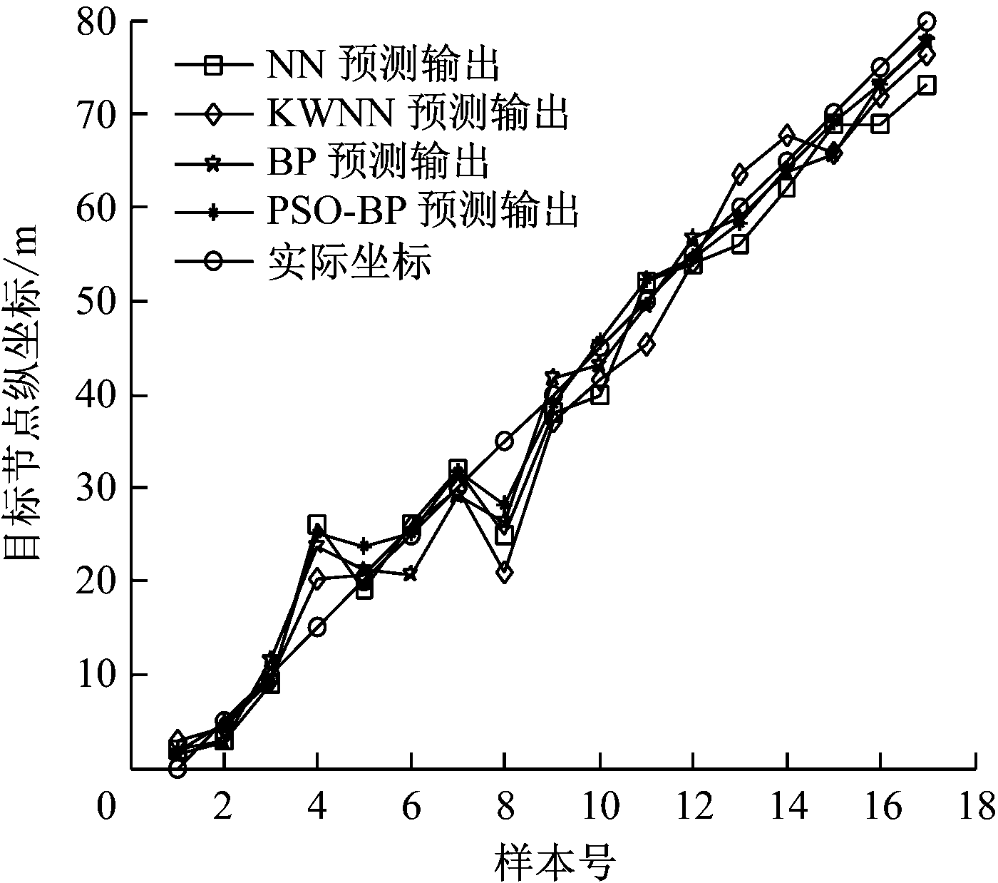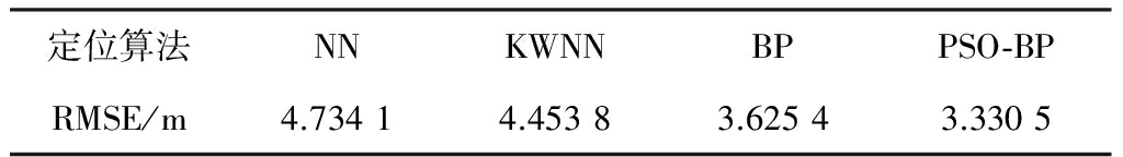 根据图3所示曲线计算出各定位算法均方误差(RMSE),见表1。根据图3和表1可知,相比于NN,KWNN,BP神经网络算法,基于PSO-BP神经网络的定位算法的RMSE更小,定位精度更高。程序运行阶段,PSO-BP神经网络与BP神经网络相比,相同的精度下PSO-BP算法收敛速度更快,训练次数较少,且在相同的训练次数下,有着更高的定位精度,满足煤矿井下定位需求。