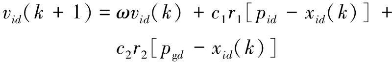 式中:xid,vid分别为第i个权值在第d维的位置及速度(0<d<D);c1,c2为学习因子;r1,r2为[0,1]的均匀随机数;pid为第i个权值的历史最佳位置;pgd为全部权值的历史最佳位置;ω为动态惯性权重:k为当前迭代次数。