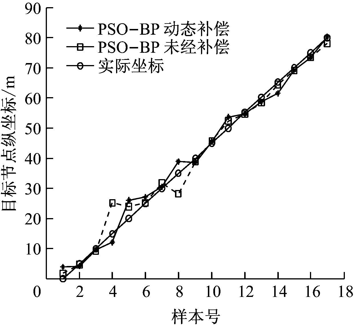 由图5可知,目标节点RSSI指纹经动态补偿后,定位坐标更加接近于实际坐标,定位精度得以提高。计算2条曲线的RMSE可得,未经动态补偿的PSO-BP算法定位结果的RMSE为3.330 5,经过动态补偿后的PSO-BP算法定位结果的RMSE为2.868 6,定位精度提高了13.87%,验证了动态补偿法更加适应随时间变化的煤矿井下环境,能够满足井下自适应定位要求。
