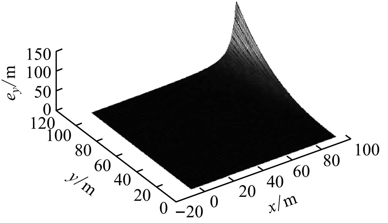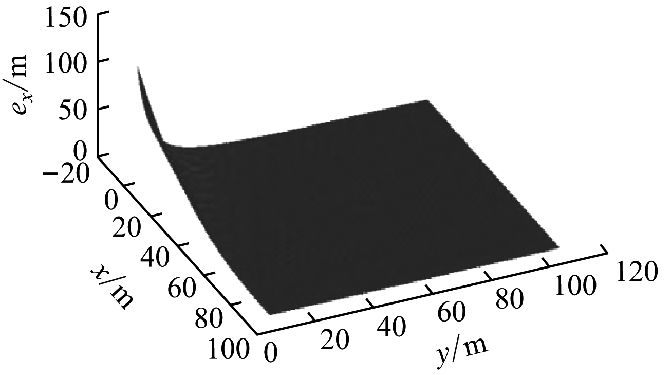 假设x1在[-5,94] m范围内移动,y1在[7,106] m范围内移动,一共有100×100个点,通过计算得出真实波速,再通过搜索目标函数,得到满足条件的最优波速值,最后反演得到相应的震源坐标(x2,y2)。记震源横坐标的理论误差值ex=|x1-x2|,纵坐标的理论误差值ey=|y1-y2|,则采用新目标函数得到的震源定位误差如图9所示。