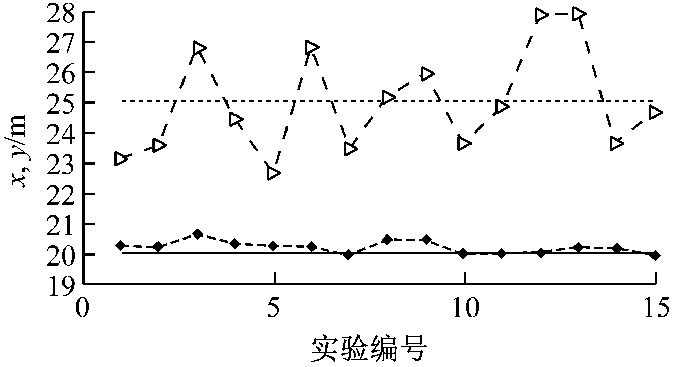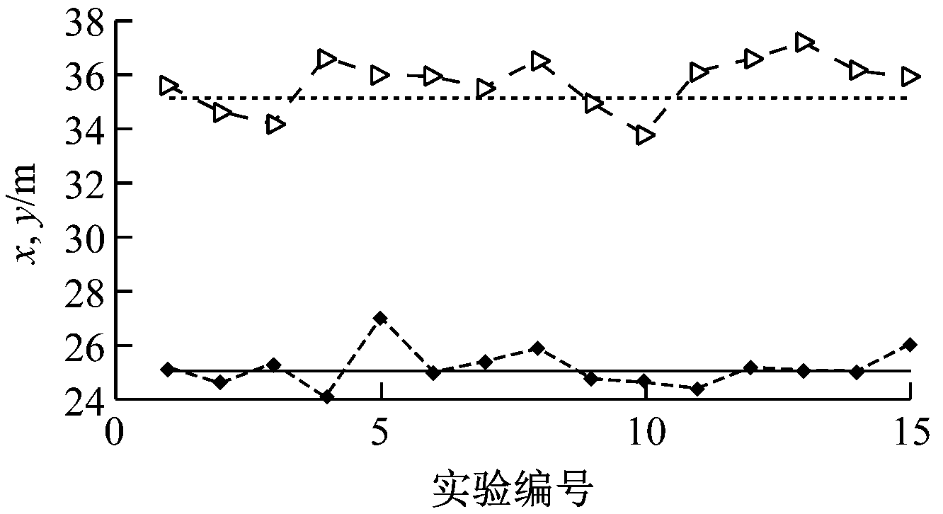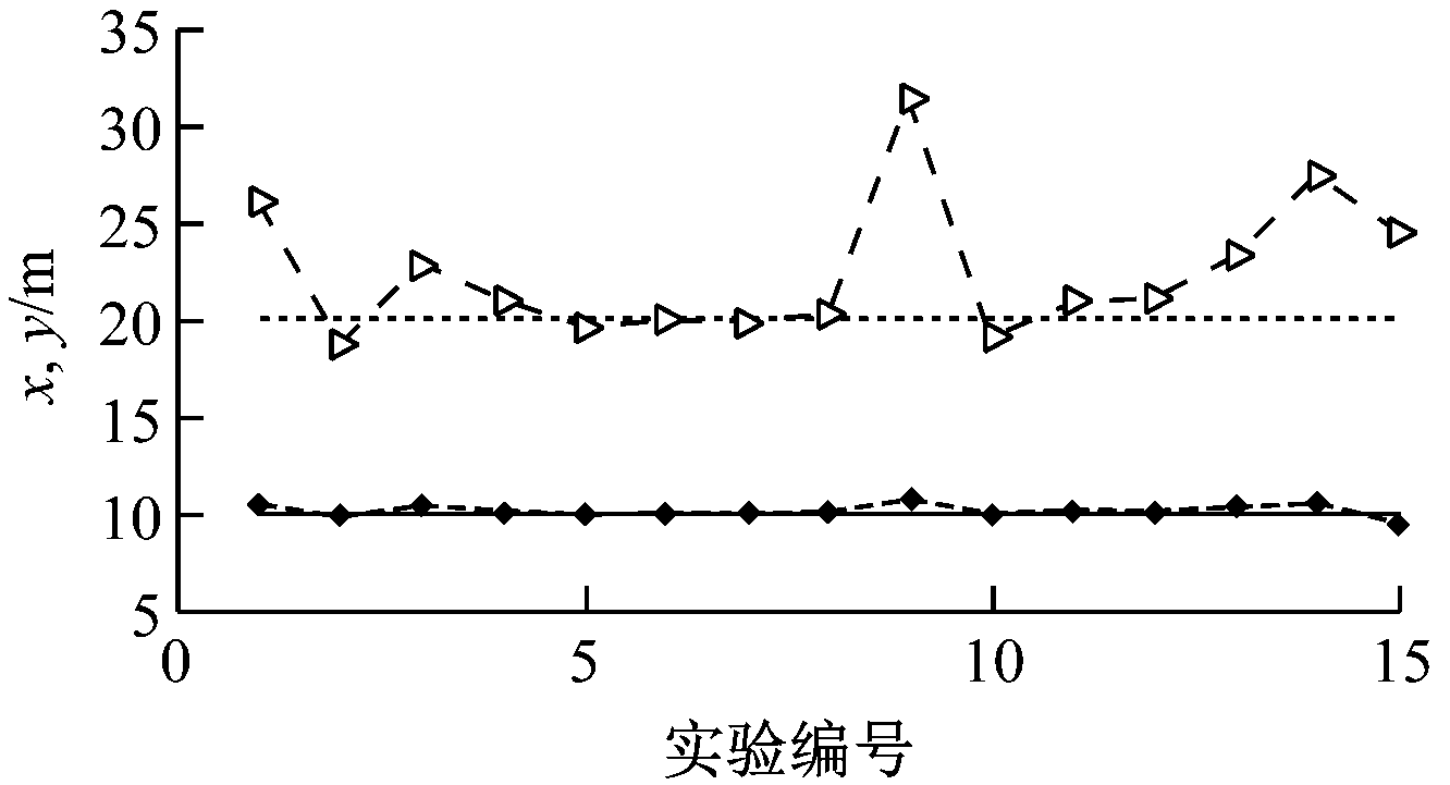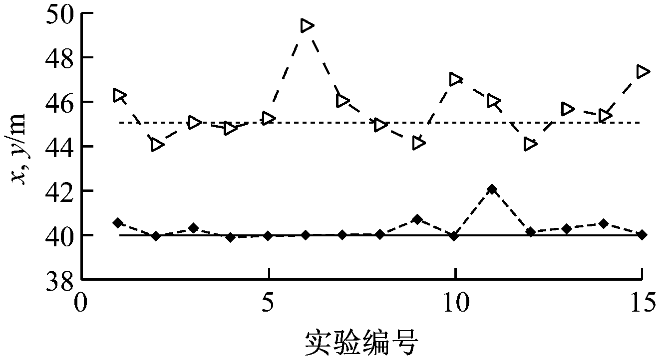 假设震源真实坐标为(30 m,25 m),取搜索区域中的4组坐标(10 m,20 m),(20 m,25 m),(25 m,35 m),(40 m,50 m),每组重复进行15次反演定位,通过控制变量法将反演出的定位坐标和真实坐标作对比,结果如图5所示。