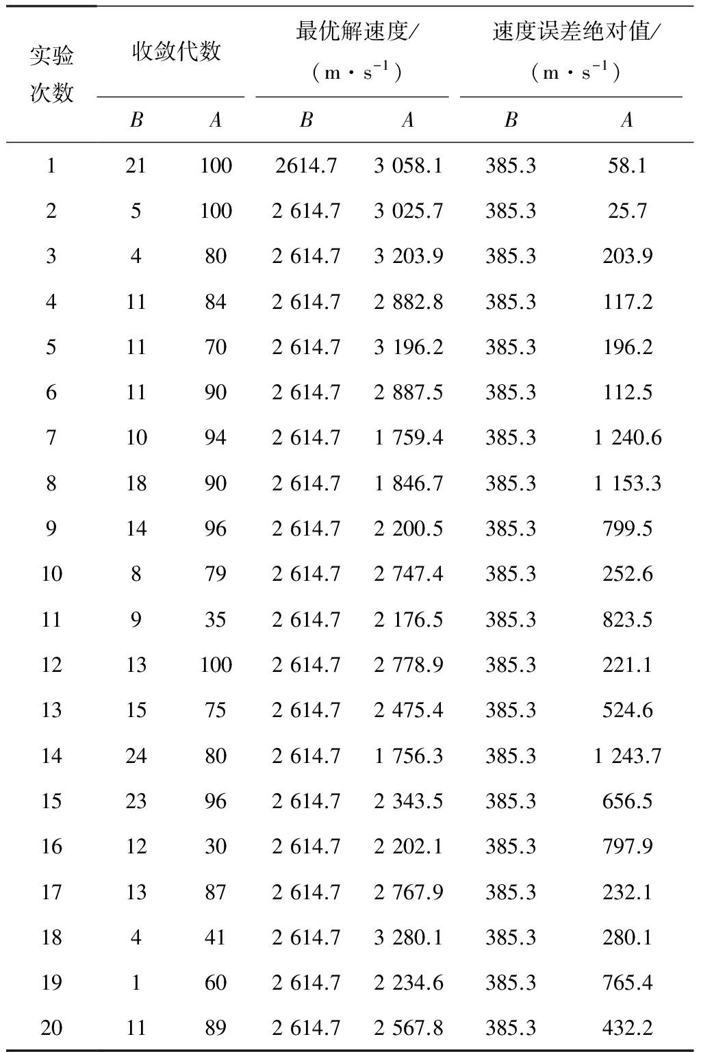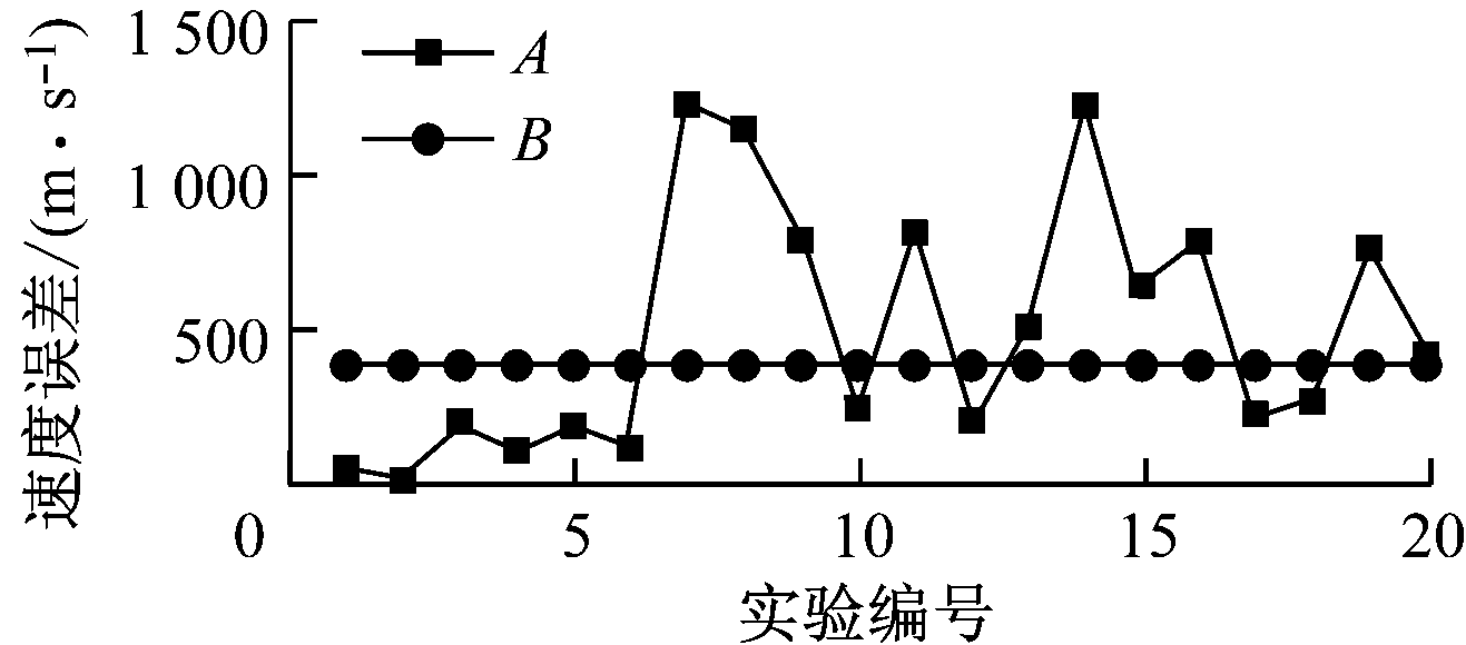 新旧目标函数的速度误差对比如图8所示。从图8可看出,B的速度一直很稳定,而A的速度不稳定,波动很大。同时B的速度和实际速度的误差一直稳定为385.3 m/s,而A的速度误差波动很大,刚开始为58.1 m/s,最大值为1 243.7 m/s,都没有收敛到真实速度,这是由于计算机的计时精度等因素引起,与目标函数和算法等无关。