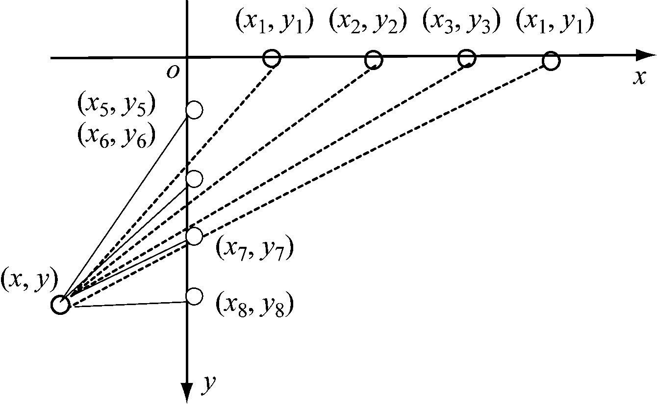 当双坐标排列的检波器坐标为(x1,y1),(x2,y2),(x3,y3),(x4,y4),(x5,y5),(x6,y6),(x7,y7),(x8,y8)时,将在x轴和y轴分别放置的4组检波器两两组合,得f1(x)=|x1-x2|,f2(x)=|x3-x4|。令目标函数f(x)=|f1(x)|+|f2(x)|,由于x是关于v的函数,要使得目标函数最小,只需要找到满足条件的最优解v,再由v反演相应的x,y值,即可对远场震源进行定位。