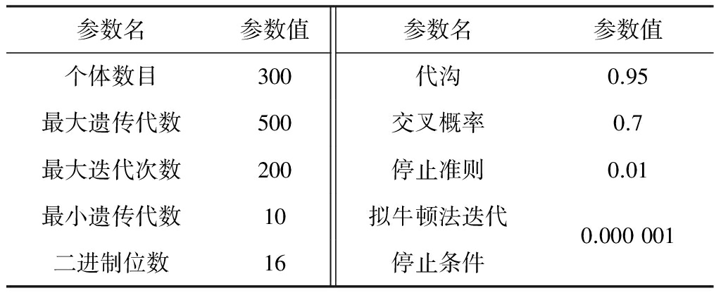 改进GA算法流程如图2所示。首先使用GA算法进行初始寻优,当搜索范围缩小到一定程度时结束寻优过程;再将GA算法得到的最优解作为拟牛顿法寻优的初值进行精确寻优;当拟牛顿法寻优过程结束时,判断所得的最优解是否符合预期,如果符合则将其作为最终结果输出,否则使用GA算法进行一定次数迭代,将得到的最优解作为最终结果输出。由于GA算法不需要寻找精确解,所以,只要个体数量足够多、能够较好地覆盖最优解可能存在的位置即可。