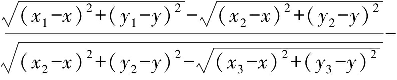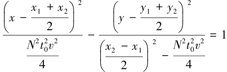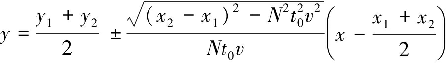 以坐标分别为(x1,y1),(x2,y2)的检波器为例,测得震波到达2个检波器的时间差T=Nt0,其中t0为AD转换周期,N为通过人工或机器读取的到达时间,在实际情况下,t0和N为整数,为了讨论方便,假设T>0。震源坐标(x,y)满足如式(4)所示的双曲线方程和式(5)所示的渐近线方程。