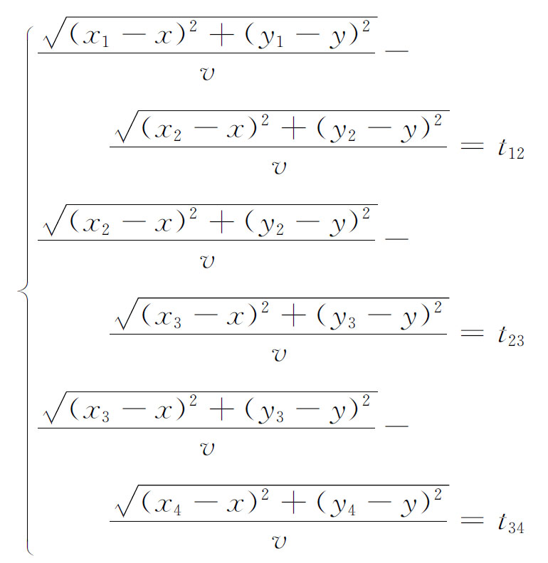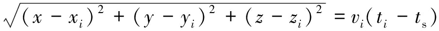 式中:(x,y,z)为震源坐标;(xi,yi,zi)是编号为i的检波器的坐标;vi是编号为i的检波器接收到的震波在介质中传播的平均波速;ti是编号为i的检波器接收到震动的时刻;ts为震源的起震时刻。