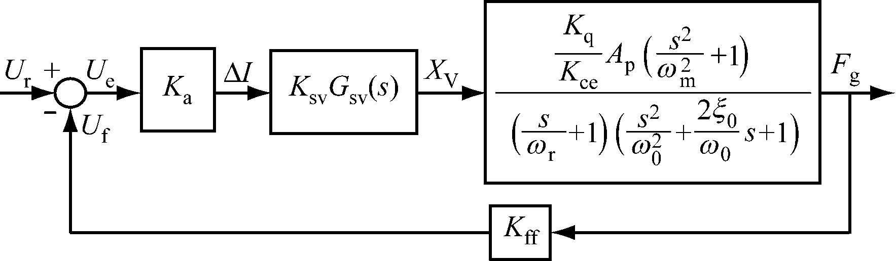 拉紧装置液压系统传递函数框图如图2所示,其中Ur,Uf,Ue分别为指令电压、反馈电压、偏差电压;Ka为伺服放大器增益;Kff为压力传感器增益。