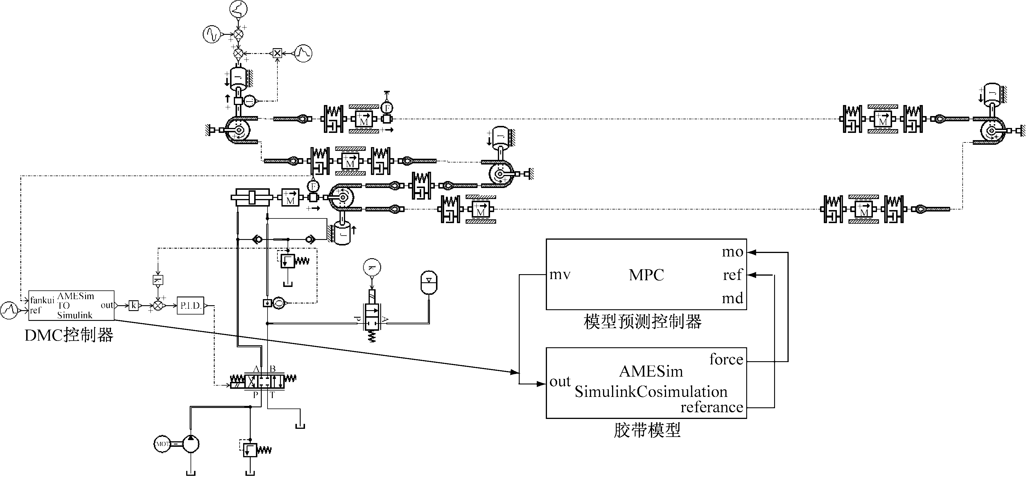 (1) 介绍了带式输送机拉紧装置的工作原理、数学模型及其校正,设计了基于DMC-PID控制的带式输送机拉紧装置张力控制系统。通过AMESim/Simulink联合仿真建立了完整的带式输送机系统模型,克服了单一软件建模仿真的不足,结合智能控制算法,提高了仿真数据的准确性。