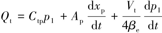 式中:Ctp为液压缸总泄漏系数;p1为进油腔压力;Ap为液压缸活塞有效面积;xp为活塞位移;Vt为总压缩容积;βe为有效体积弹性模量。