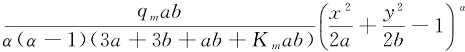 式中:w(x,y)为岩层在(x,y)处的挠度参数;α为下沉移动轨迹在垂直方向上的形态参数,0<α≤2;qm为第m层岩层所承受载荷;a,b为弯曲带内所有岩层椭球抛物面基本参数的平均值;Km为第m层岩层受到其下一层岩层的反力系数。