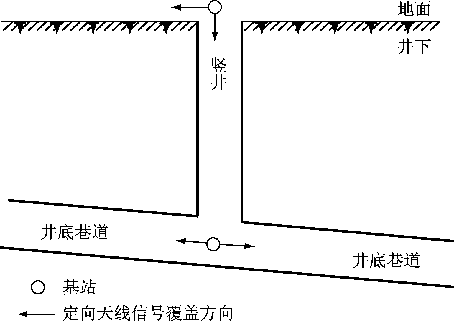 井下综合基站采用定向天线,根据巷道不同情况分别进行布设。其中直巷的天线分别向前后2个方向覆盖,覆盖范围为600~800 m;在弯曲巷道或巷道交错区域的弯曲处或拐弯处布设1个基站,并根据巷道的走向调整天线角度进行覆盖。综合基站布设方法如图7所示。