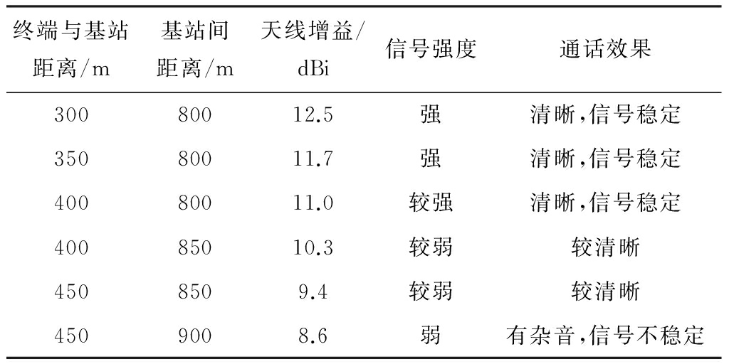 测试结果表明,2个基站之间距离不超过800 m、终端与基站之间通信距离不超过400 m时,基站天线增益不低于11.0 dBi,接收灵敏度不大于-105 dB·m,基站最远处的信号强度不低于-105 dB,通话质量较好。