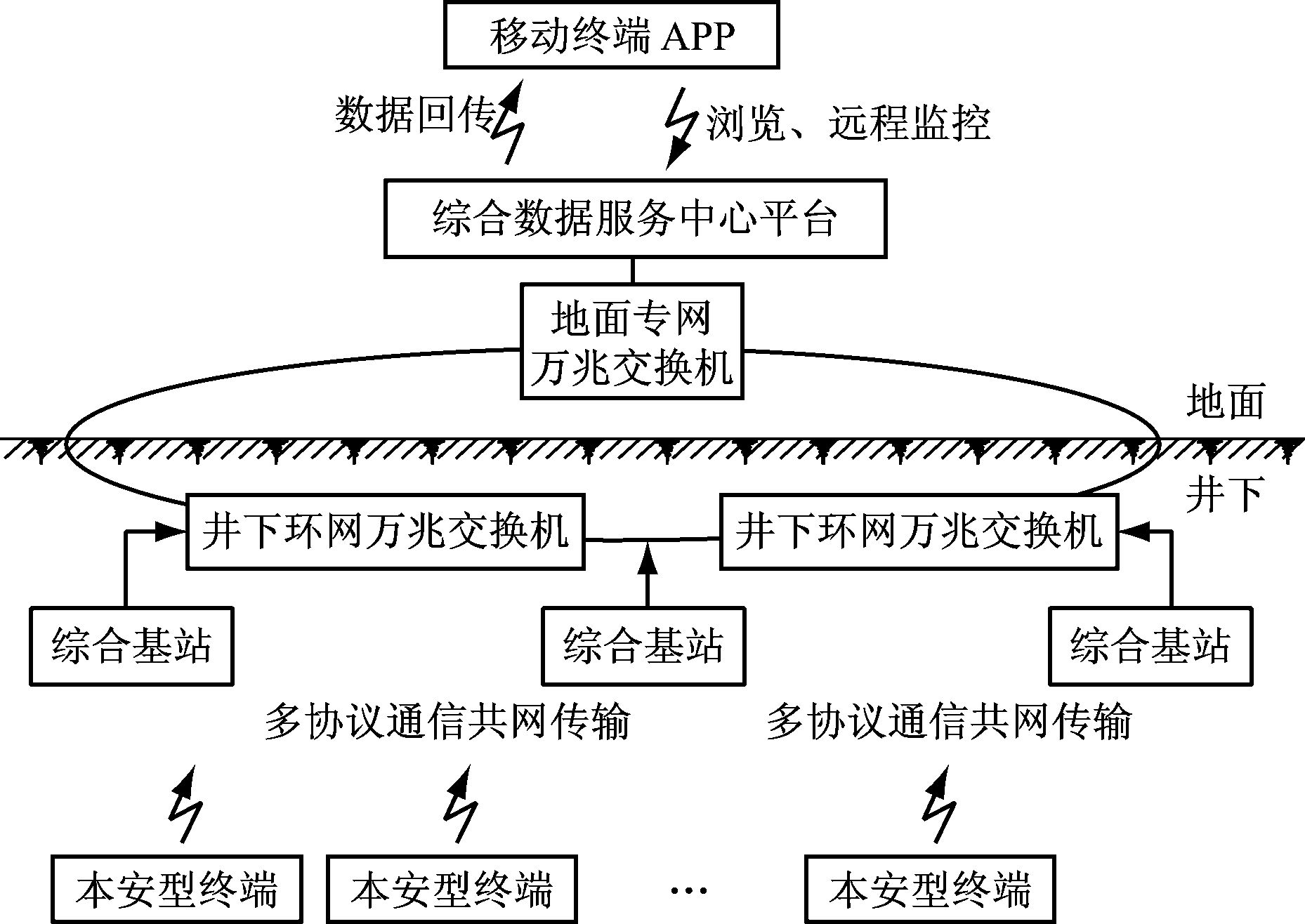 基于LTE的全矿井融合通信系统由核心网、信令网关、综合数据服务中心平台、矿用本质安全(以下简称本安)型综合基站、矿用本安型天线、矿用本安型终端(包括矿用本安型手机、矿用本安型执法记录仪、矿用多参数气体测定器等)及其他配套设备组成[3-5],如图3所示。