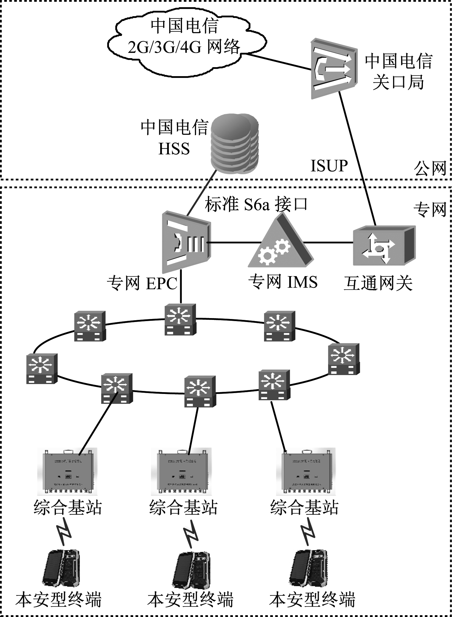 (1) EPC对接。中国电信对专网EPC(4G核心网)开放了S6a接口。专网EPC通过标准S6a接口——Diameter/SCTP与电信HSS(Home Subscriber Server,归属用户服务器)互联,接入电信网络,获取鉴权数据。矿用本安型终端取得专网核心网的双向鉴权后,可驻留使用专网。