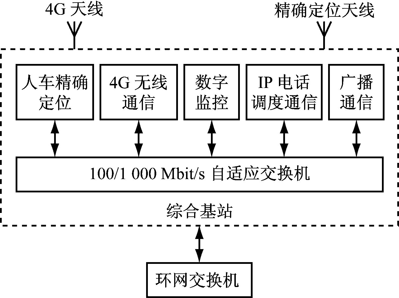 矿用本安型综合基站是全矿井融合通信系统的核心设备,其采用ATN950B万兆环网交换机,集成FDD-LTE无线通信、人车精确定位、广播通信、IP电话调度通信、工业自动化接入、串口服务器接入、供电等模块,如图4所示,可实现煤矿多系统统一调度管理,并可根据实际需要接入安全监控系统数据。