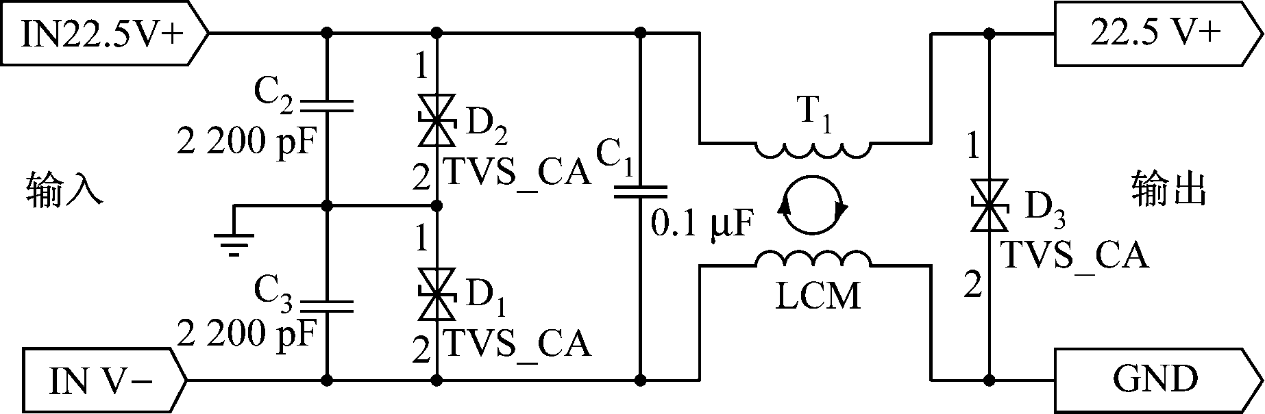 图5为基站脉冲群抗干扰电路。电容C1接在输入线两端,用于消除差模干扰。电容C2,C3接在输入线和地线之间,用于消除共模干扰。T1为共模线圈,用于消除共模干扰,其共模电感的两臂作为线路隔离电感,可对波头电压产生一定的延迟,保证瞬变电压抑制二极管D1,D2优先动作,D3延迟动作,从而减少回路大电流,有效保护电路中元件免受浪涌冲击而损坏。