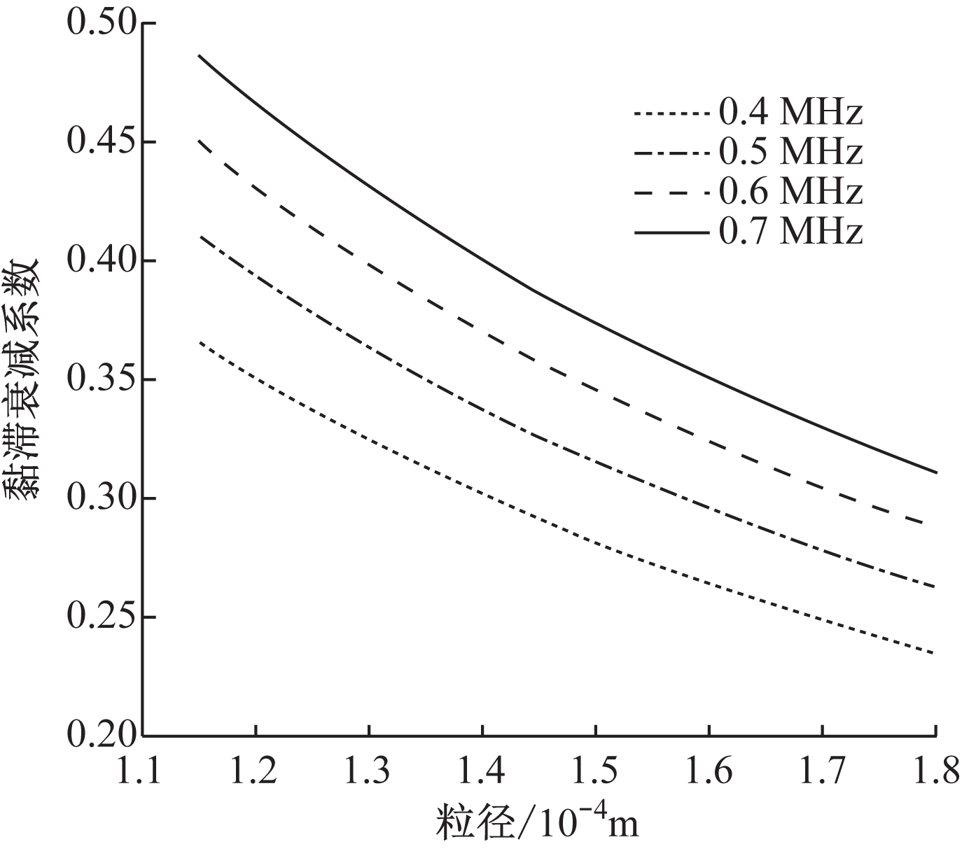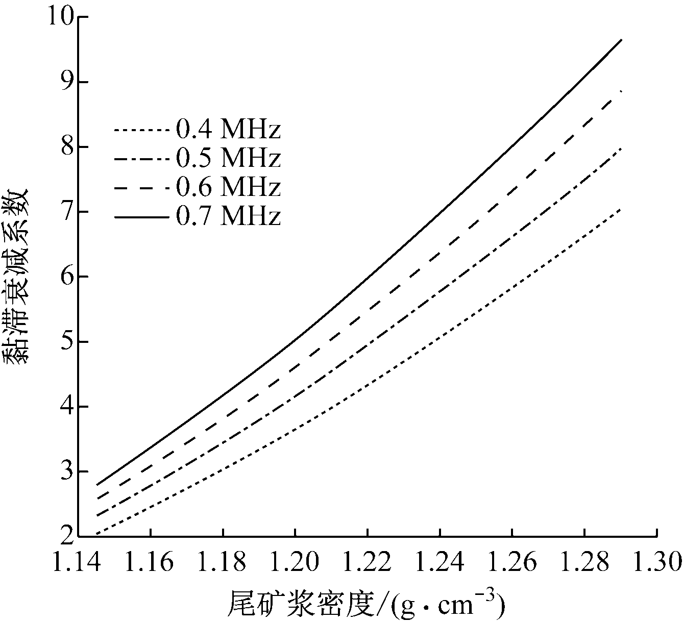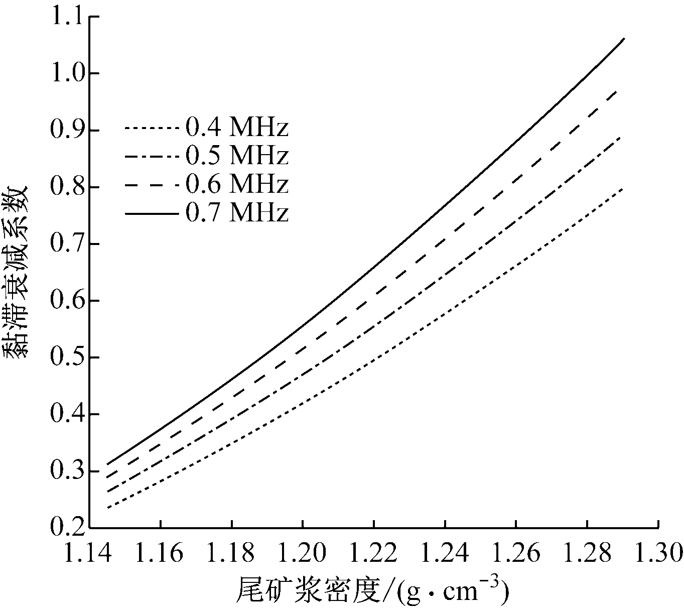 (2) 黏滞衰减相对于整体的衰减占比较小,且尾矿浆粒径为1.15×10-4~1.8×10-4m时,黏滞衰减系数非常小,可以忽略不计。当超声波的频率与尾矿浆的粒径均为固定值时,黏滞衰减系数随着尾矿浆密度的增大而增大;当超声波频率与尾矿浆密度均为固定值时,尾矿浆的粒径越大,黏滞衰减系数越小。
