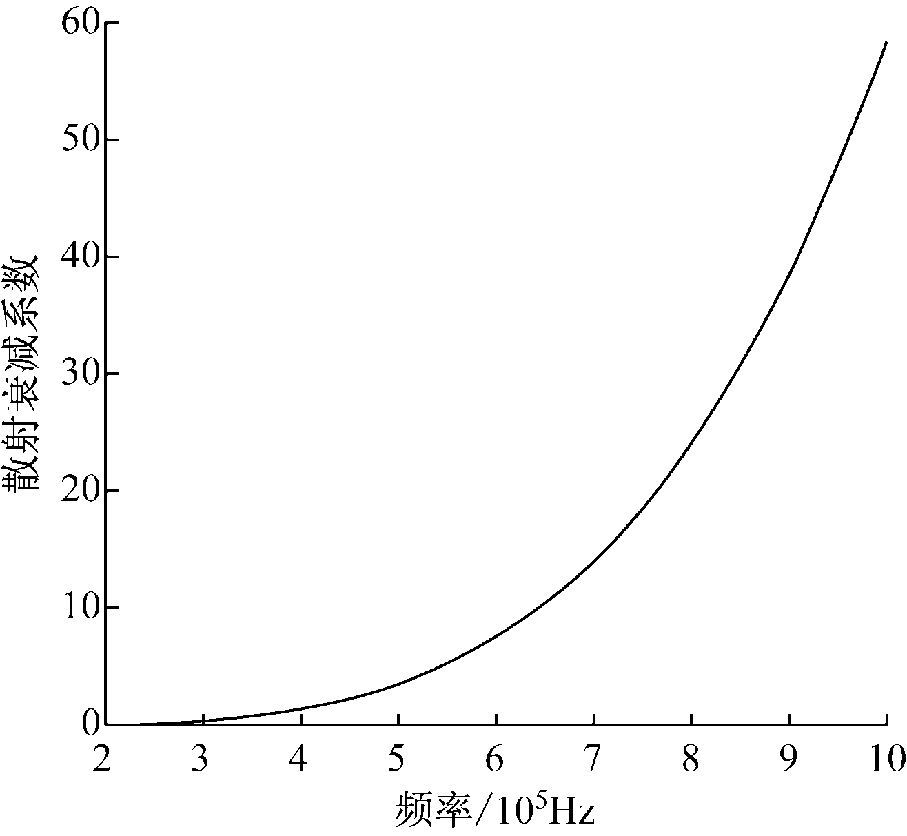 另外,从图1还可以看出,尾矿浆粒径太小时,散射衰减会很小。设置频率区间为10-6~10-2MHz,应用Matlab计算出尾矿浆粒径极小点为a=5.563 7×10-5m,而尾矿浆粒径的最小值为7.5×10-6m,大于极小值点,所以,超声波在尾矿浆中传播时的散射衰减不可忽略。