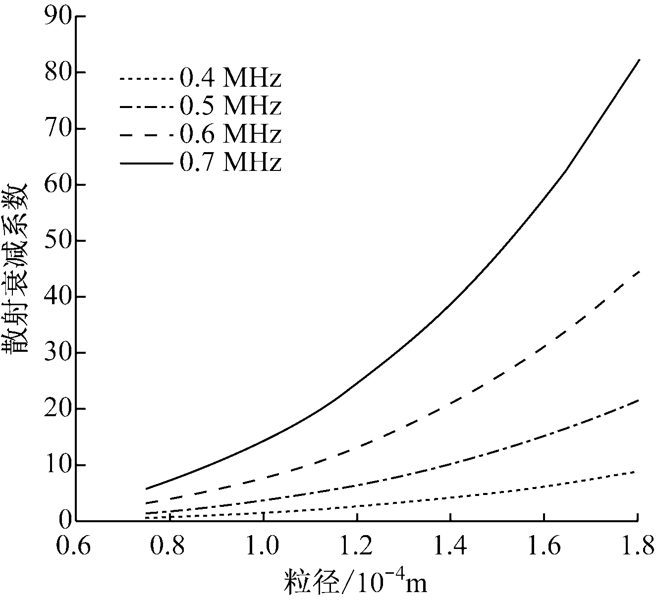 将尾矿浆粒径变化范围设为7.5×10-5~1.8×10-4m,超声波频率设为0.4,0.5,0.6,0.7 MHz,对超声波的散射衰减系数进行数值模拟仿真,尾矿浆粒径与散射衰减系数的关系曲线如图1所示。