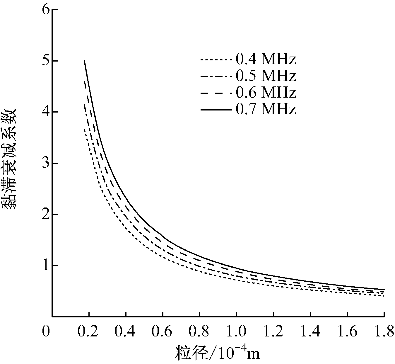 为了更准确地分析尾矿浆粒径与黏滞衰减系数的关系,将尾矿浆的密度与超声波的频率设置为固定值,设置尾矿浆的密度为1.2 g/cm3,超声波的频率为0.4,0.5,0.6,0.7 MHz,尾矿浆粒径与超声波黏滞衰减系数关系曲线如图5所示。