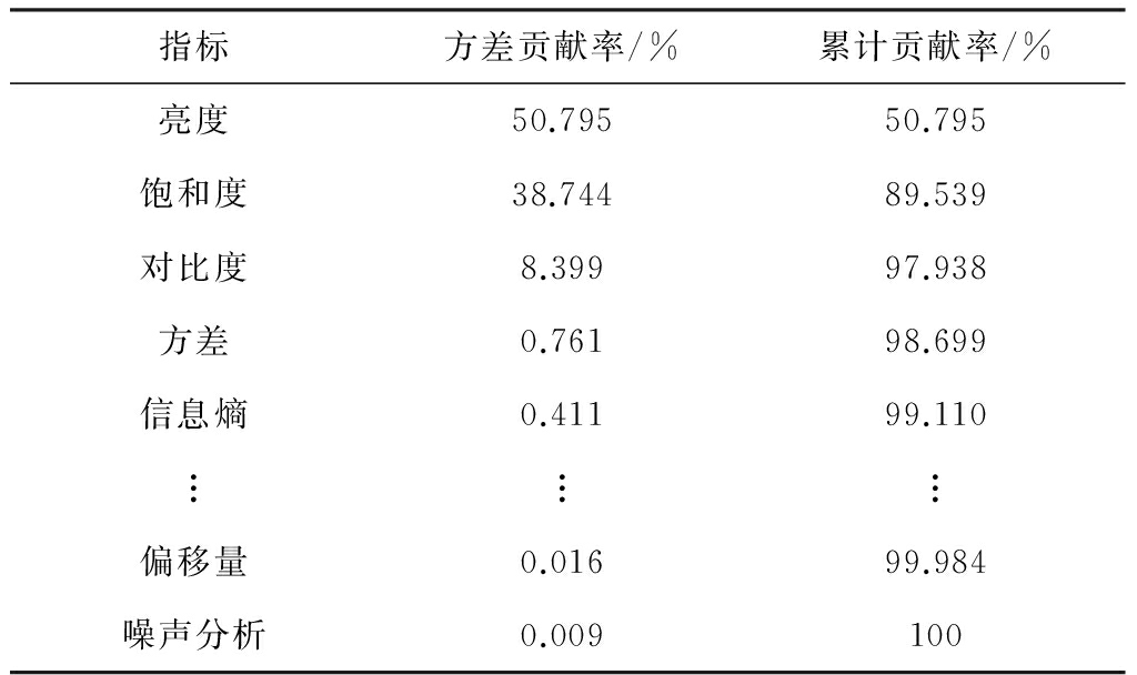 根据文献[15]选取图像指标参数:亮度、饱和度、对比度、方差、信息熵、均方误差、相关性纹理、信噪比、平滑度、噪声分析、平均梯度、偏移量。对上述参数进行指标化处理,并在Matlab中求出雾尘图像的协方差矩阵、特征值和贡献率,结果见表1。