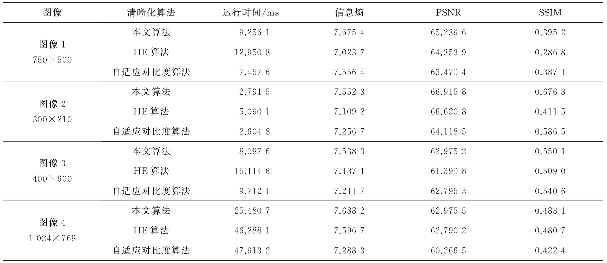 由表2和图3可知,对于不同分辨率的雾尘图像,本文算法与HE算法、自适应对比度算法相比,运行时间有了一定程度的提升,实时性较好;经本文算法处理后图像的信息熵比原始图像的信息熵大,表明图像包含的信息量增大,并且本文算法的信息熵值在3种算法中最大;根据PSNR与SSIM可知,本文算法在处理过程中失真较少,图像结构完整性较好。
