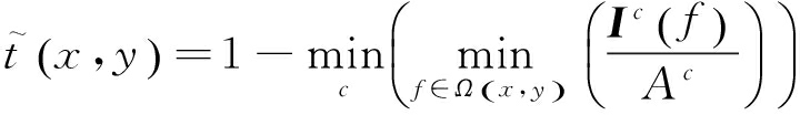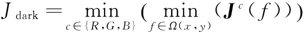 式中:Ω(x,y)表示图像J中以像素点(x,y)为圆点的区域,通常情况下设为大小为定值的正方形模板;Jc(x,y)表示图像J的某一个颜色通道像素值的二维矩阵。