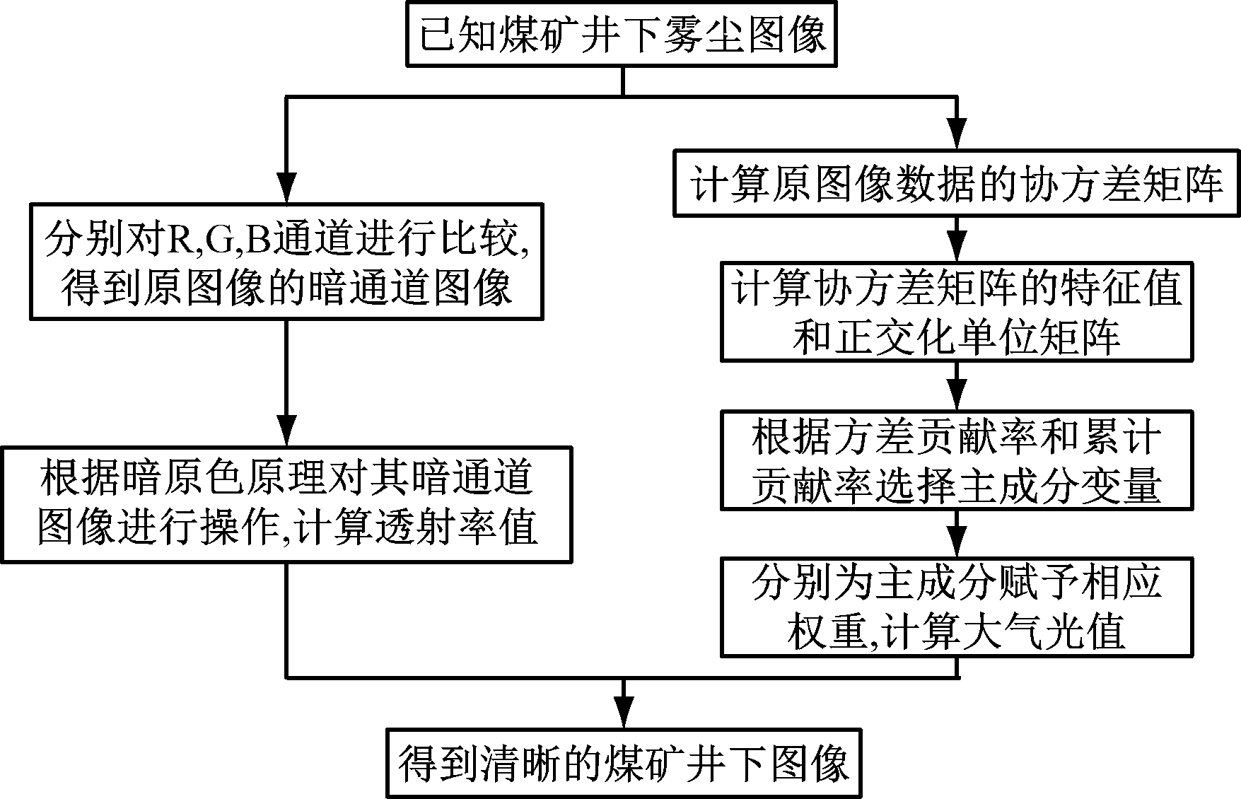 针对以上问题,本文在文献[11]的基础上,提出一种基于暗原色原理和主成分分析(Principal Components Analysis,PCA)法的煤矿井下雾尘图像清晰化算法。该算法根据暗原色原理计算大气散射模型中的透射率,并利用PCA法建立雾尘图像像素间的线性关系,提高了大气光值计算的准确度。该算法细节处理较为突出,可对图像整体进行较为全面的处理,能够有效消除井下雾尘对监控画面的影响。