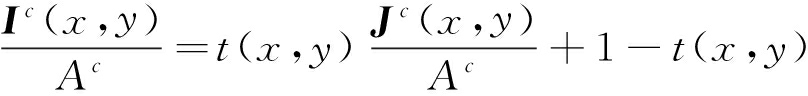 式中:I(x,y)为雾尘图像像素值二维矩阵;J(x,y)为清晰图像像素值二维矩阵;t(x,y)为透射率,指太阳光在雾尘条件下的透过程度;A为雾尘条件下的大气光值。