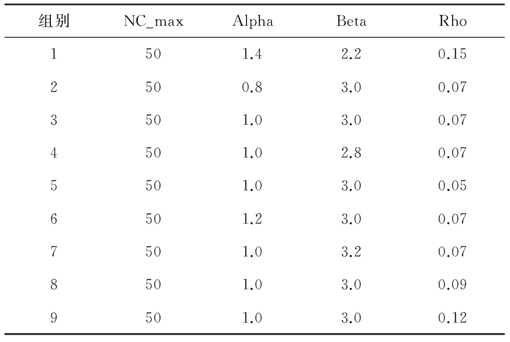 表6中,NC_max代表最大迭代次数;Alpha表示信息素相对重要性;Beta表示行走难易度相对重要性;Rho表示信息素挥发系数。