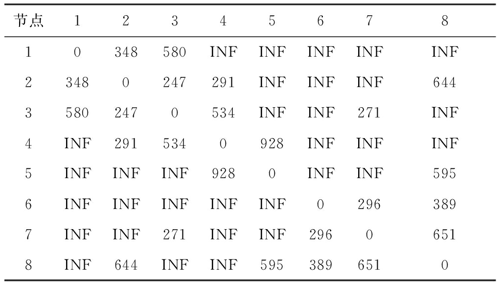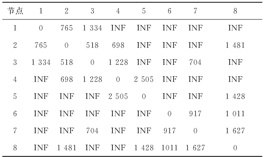 利用Matlab软件求得8个关键节点之间的距离,构建距离矩阵。如果节点之间不直接连接,则将其距离设置为无穷大,用INF表示。编程计算得到距离矩阵,见表3。