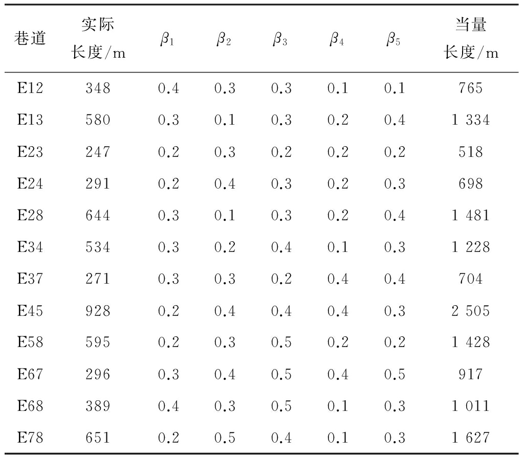 通过现场模拟与测量,得到巷道的影响因素系数和巷道当量长度,见表4。巷道影响因素系数包括巷道有效宽度、巷道有效高度、巷道坡度、路面湿度和有无障碍物,分别用β1—β5表示。
