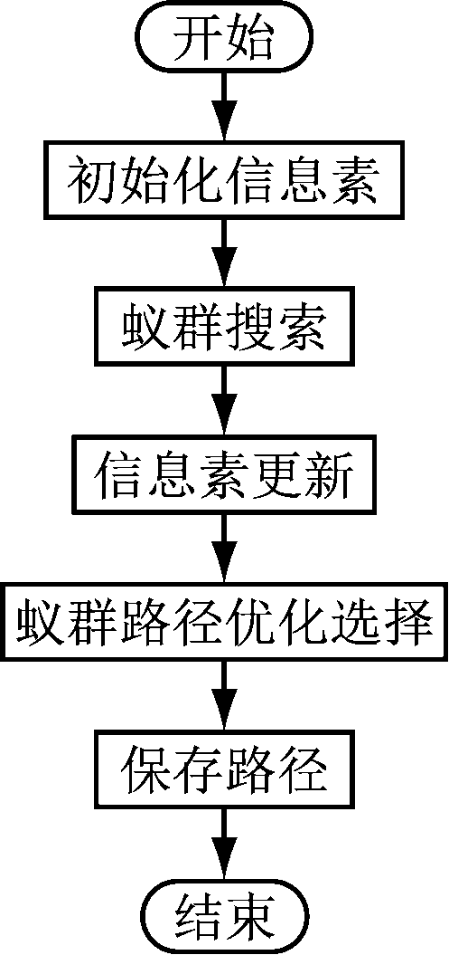 选择路径的原则:信息素越大,被选择的概率越高。因此,求取最优路径问题可转换为求取τij最大值问题,τij值越大,蚂蚁选择的概率越高。蚁群算法流程如图2所示。