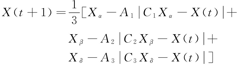 式中:A1,A2,A3,C1,C2,C3为系数;Xα,Xβ,Xδ为猎物所在点;X(t+1)为当前狼群所在点。