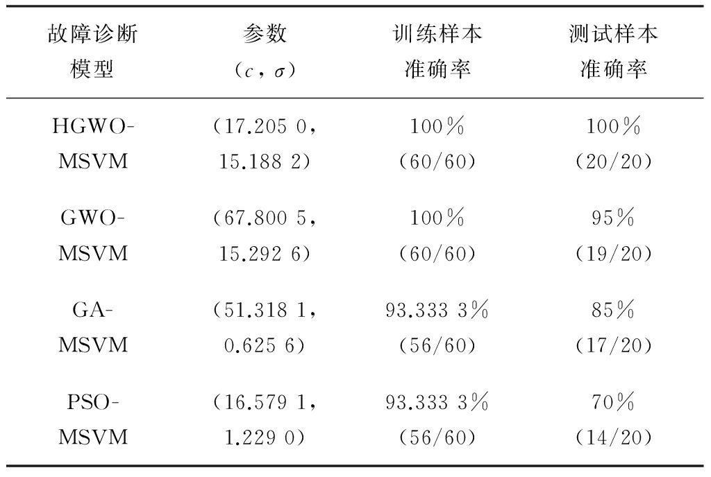 经过80组样本的学习拟合,建立了基于HGWO-MSVM、GWO-MSVM、GA-MSVM及PSO-MSVM的采煤机轴承故障诊断模型。参数设置如下:HGWO算法的种群范围是10,迭代上限是200,缩放因数下界是0.1,上界是0.9,交叉率是0.8。MSVM参数c的变化范围是0.01~100,σ的变化范围是0.01~100,交叉验证次数是5。GWO算法的种群范围是10,迭代上限是200。GA算法的种群范围是10,迭代上限是200,交叉概率是0.9,交叉验证次数是3。PSO算法的种群范围是10,迭代上限是200,速度调节参数为1.6和1.5,惯性权重是0.5。