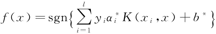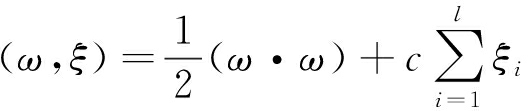 令训练样本为xi,i=1,2,…,l(l为样本个数),xi∈Rz,样本输出yi∈{+1,-1}。其中,z为空间的维度。设分类面方程为ω·x+b=0。引入非负松弛变量ξi和惩罚因子c,ξi≥0,c>0,则问题转化为如下约束优化问题: