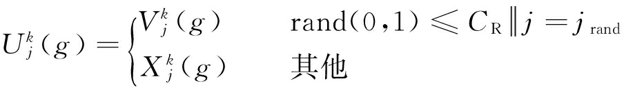 式中:F为缩放因素;g=0,1,…,M,M为最大迭代次数;CR为交叉率;jrand为[1,d]的任意整数;h1,h2,h3为3个互不相同的整数。