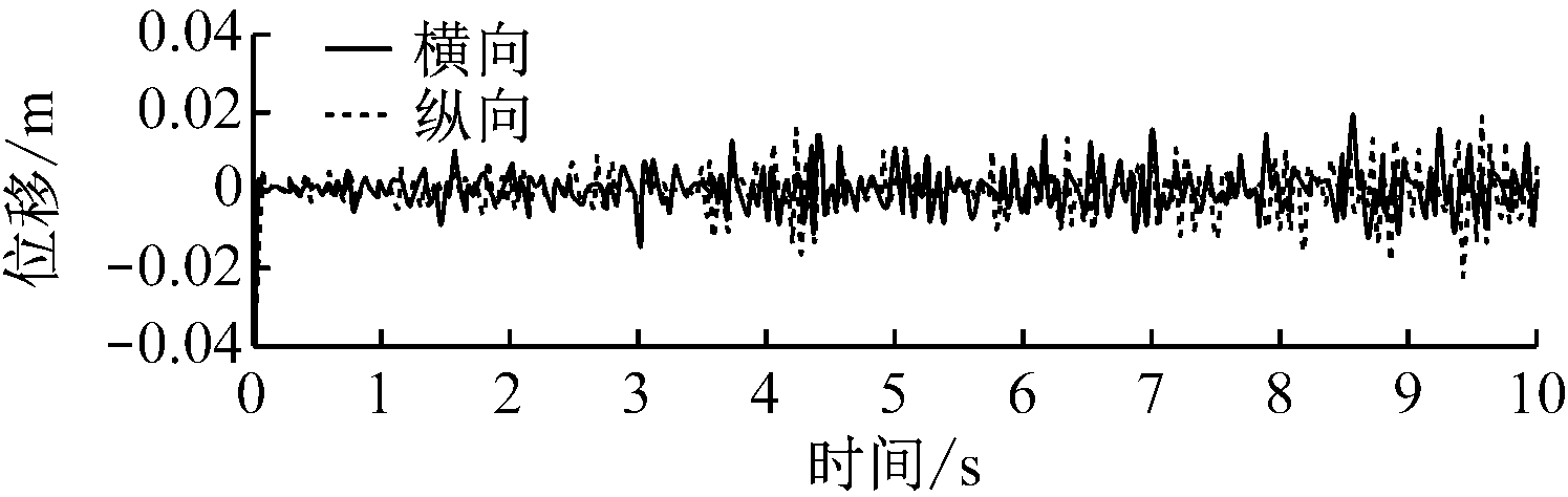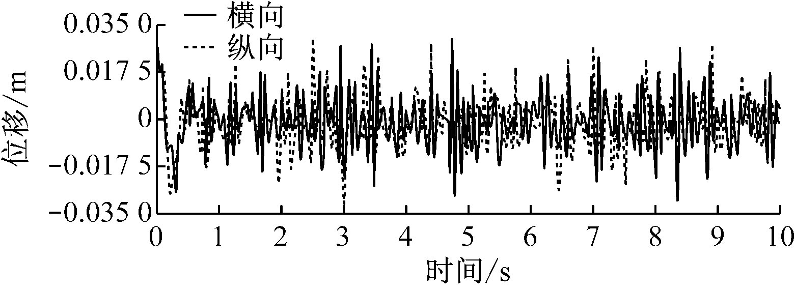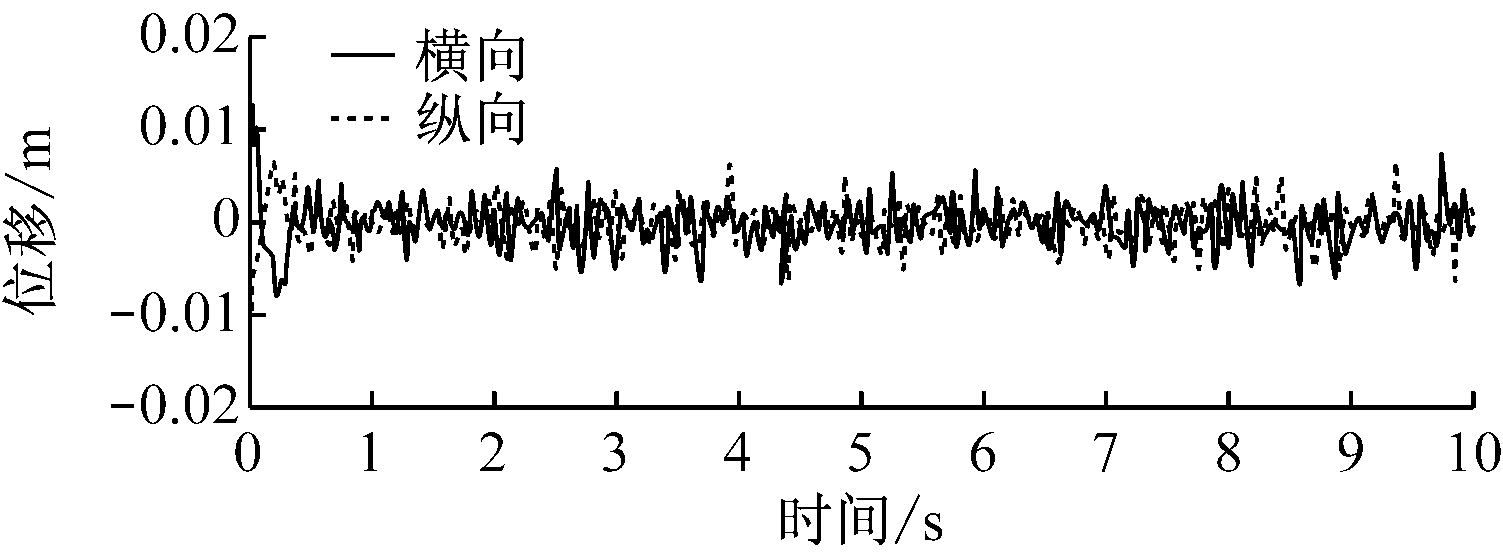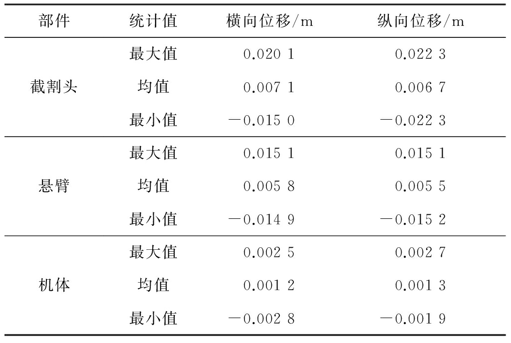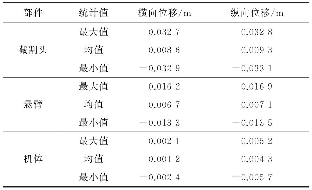 掘进机垂直截割过程中截割头、悬臂、机体随机振动的横向和纵向位移响应如图5所示,其统计值见表3。