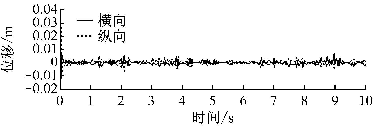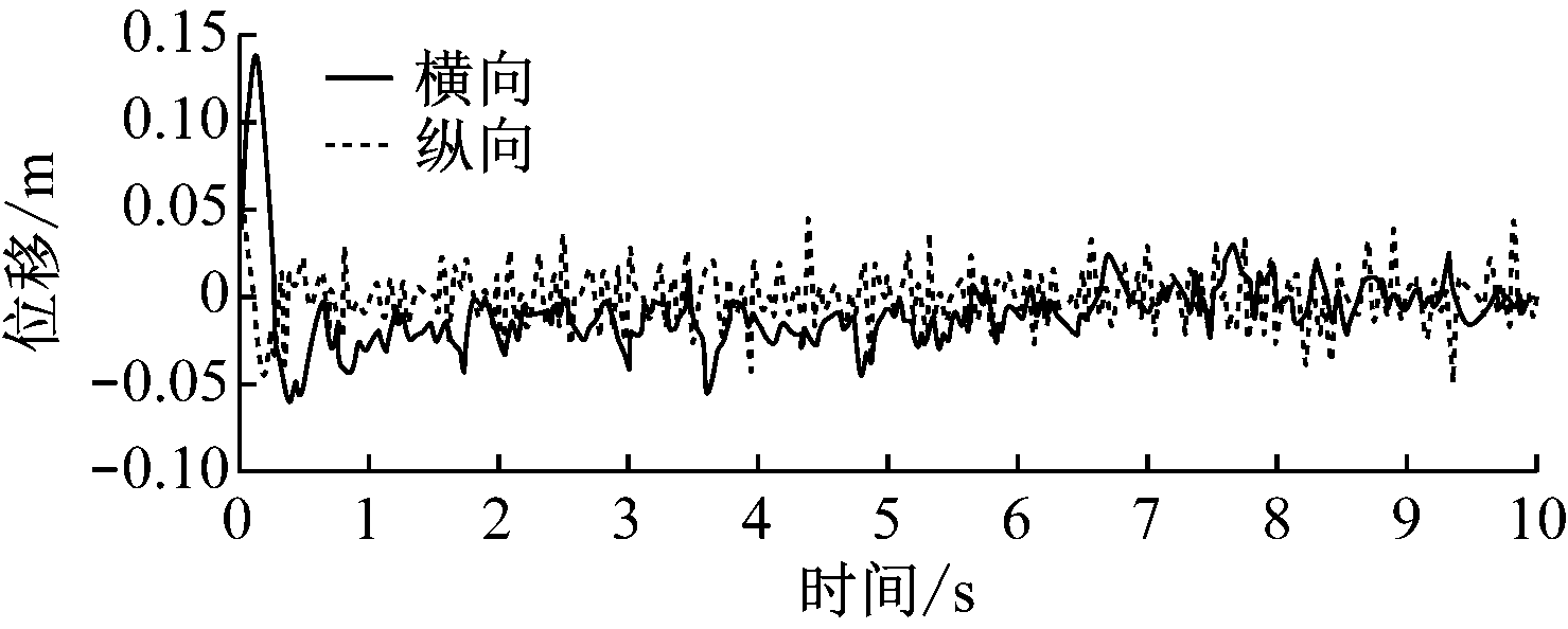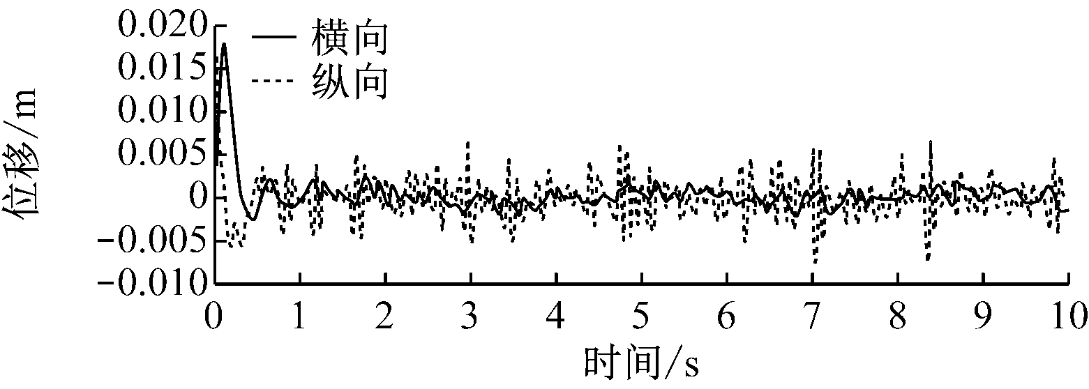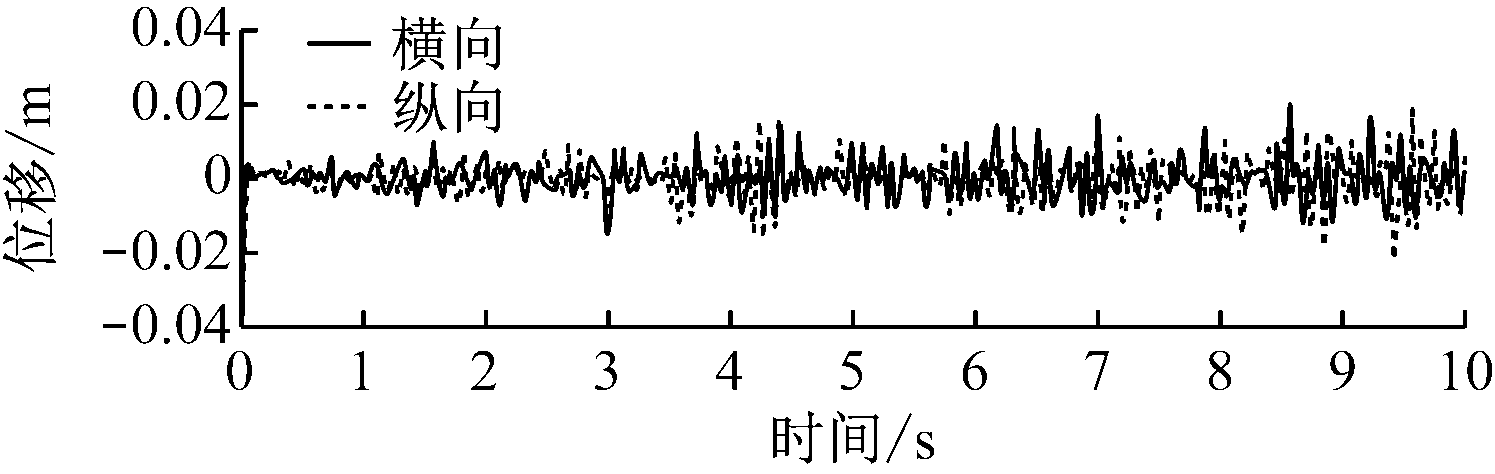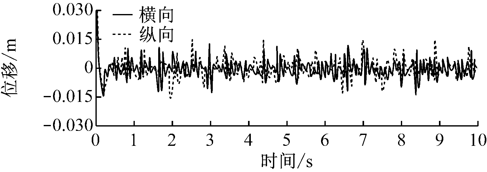 掘进机垂直截割过程中截割头、悬臂、机体随机振动的横向和纵向位移响应如图5所示,其统计值见表3。