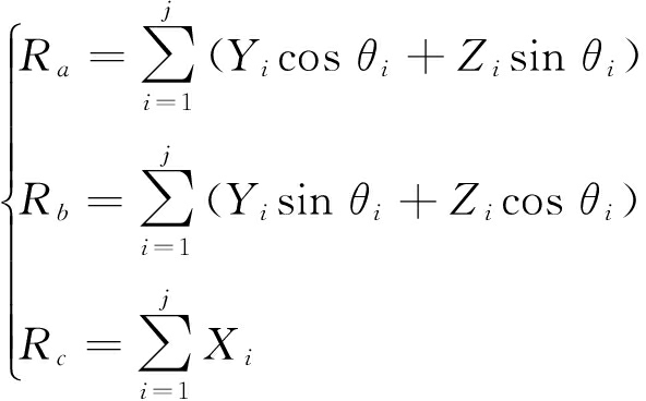 掘进机工作过程主要有轴向钻进、水平截割和垂直截割3种工作状态,3种工作状态下截割头上的截齿均受到煤岩施加的随机侧向阻力Xi、随机牵引阻力Yi和随机截割阻力Zi,将参与截割的各截齿所受的力沿截割头空间坐标a,b,c方向投影求和,可得截割头三向随机截割载荷: