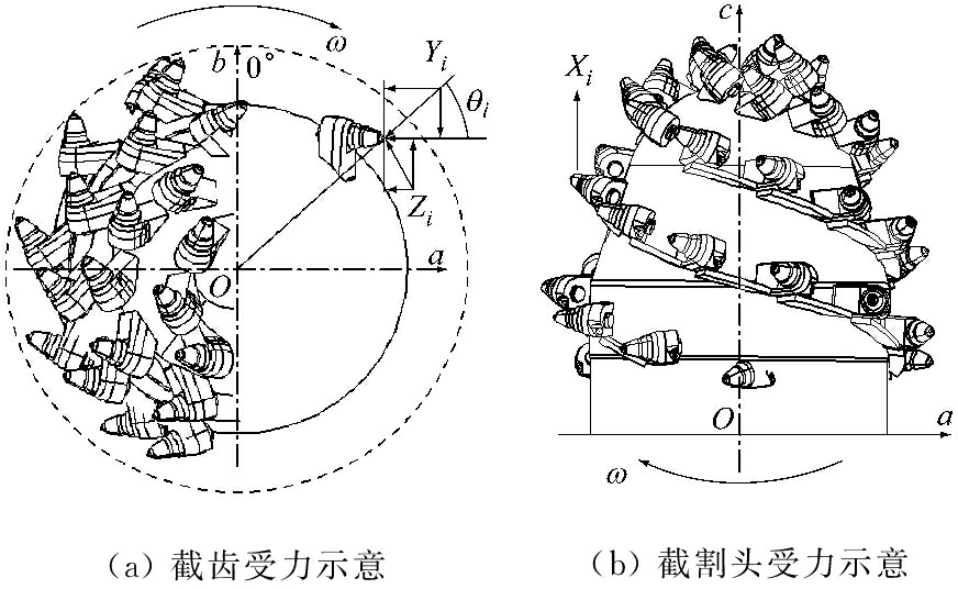 掘进机工作过程中,主要由截割头截割煤岩,因此对截割头建立载荷模型进行分析。截割头随机截割载荷模型如图1所示。Xi,Yi,Zi分别为截割头上第i(i=1,2,…,j,j为同时参与截割的截齿数)个截齿所受的随机侧向阻力、随机牵引阻力、随机截割阻力;θi为第i个截齿的圆周角,θi=ωt,ω为截割头转动角速度,t为截割头转动时间;a,b,c分别代表截割头横向摆动方向、截齿沿工作面垂直方向、掘进机轴向推进方向。