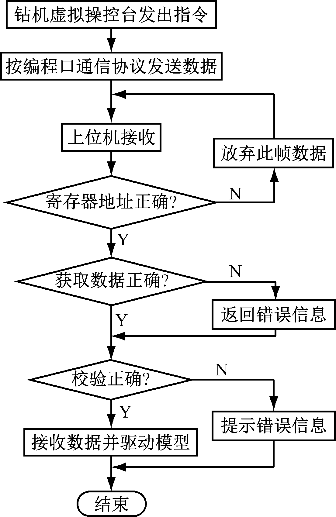 钻机虚拟操控台发出的模拟量和开关量控制指令由模拟量输入模块和PLC采集,之后将数据存储在设定的寄存器内并对采集数据进行处理,通过SC-09电缆将数据发送给虚拟软件平台,完成对虚拟钻机的控制。以钻机虚拟操控台控制虚拟钻机急停为例,按照编程口通信协议发送全部数据“02 30 31 30 46 36 31 32 30 31 30 30 03 33 34”,其中“02”为STX(开始标志),“30”为字元件状态读操作,“31 30 46 36”为D123寄存器的地址,“31 32”表示写入2个字节的数据,“30 31 30 30”表示从寄存器中读出“0001”,“03”为ETX(结束标志),“33 34”为累加和校验。发送该指命后,PLC返回ACK,表示校验无误,PLC输出一个开关量控制命令停止钻机工作。