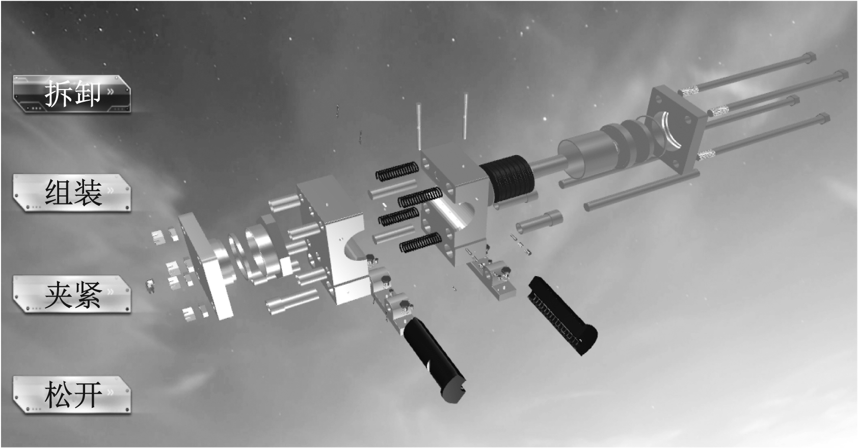 卡盘和夹持器是钻机中最重要的2个部件,实际使用过程中需要经常更换零件。为使操作人员尽快掌握卡盘、夹持器结构,熟练卡盘、夹持器拆装,设计了卡盘、夹持器虚拟拆装功能[12],主要实现步骤:在MAYA软件中将钻机的主要部件进行细化,对每个零件进行建模,再转换为.X文件导入虚拟软件平台中,通过改变Motion通道中的位置信息实现零件动作,每个动作由点击鼠标触发;每个独立零件设置成相应的独立热区,鼠标放到零件上时热区会被激活,零件显示特殊颜色,说明零件可进行拆装,显示特殊颜色通过鼠标移动触发实现。卡盘和夹持器虚拟拆装界面如图3所示。