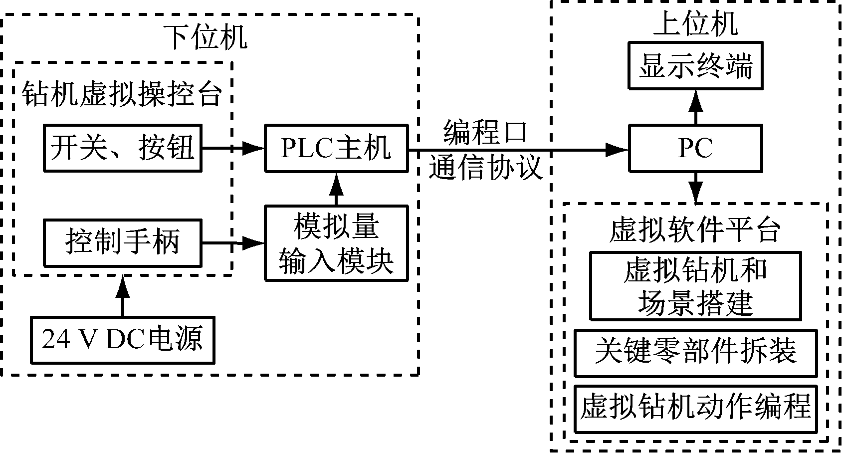 煤矿全液压钻机培训系统组成如图1所示。上位机由PC、显示终端及虚拟软件平台组成:PC为仿真模拟提供运算和实施平台;显示终端用于显示虚拟仿真效果;虚拟软件平台选用Quest3D软件[9-10],实现虚拟钻机和场景搭建、关键零部件虚拟拆装和虚拟钻机动作编程。下位机由钻机虚拟操控台、模拟量输入模块、PLC主机组成:钻机虚拟操控台包括按钮、开关和控制手柄,用于下发钻机的模拟量和开关量控制指令;模拟量输入模块将模拟量转换为数字量并传输到PLC主机中;PLC主机实时采集、处理钻机虚拟操控台的模拟量和开关量控制指令。上位机和下位机之间通过PLC编程口实现通信,用以驱动虚拟软件平台中钻机模型动作。