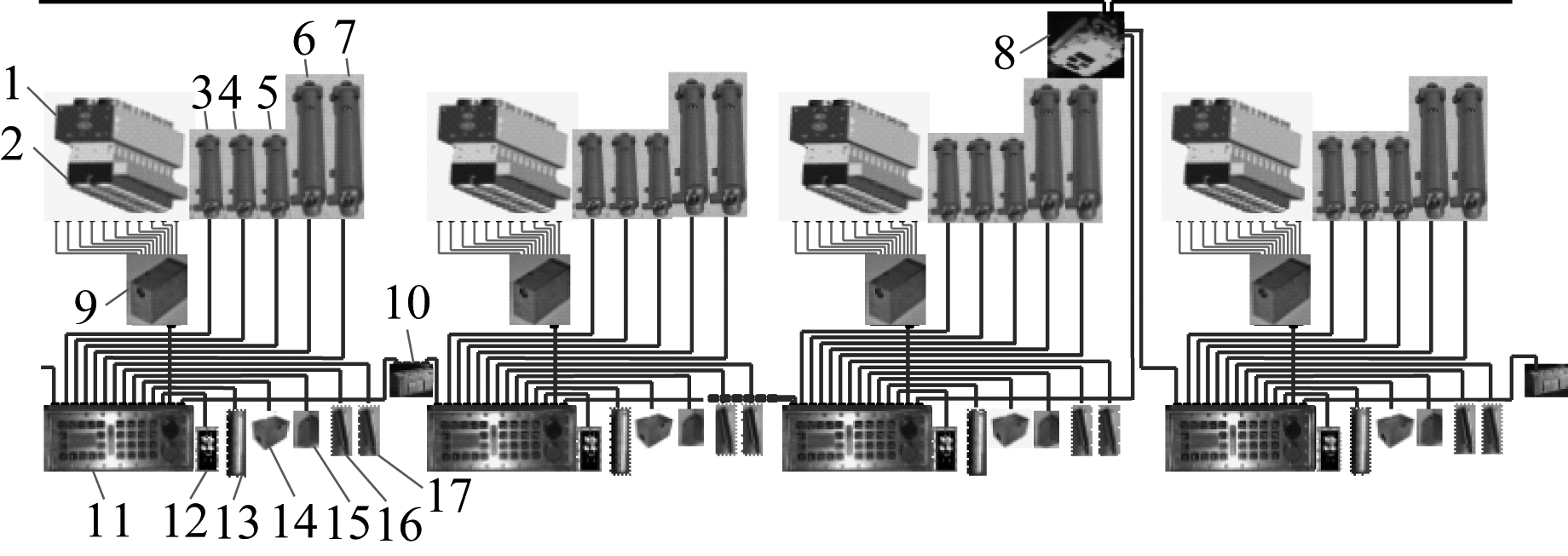 1-主控阀组;2-电磁阀组;3-护帮板行程传感器;4-尾梁行程传感器;5-插板行程传感器;6-推溜行程传感器;7-推移行程传感器;8-电源箱;9-驱动器;10-隔离偶合器;11-支架控制器;12-放煤键盘;13-红外传感器;14-倾角传感器;15-振动传感器;16-前柱压力传感器;17-后柱压力传感器