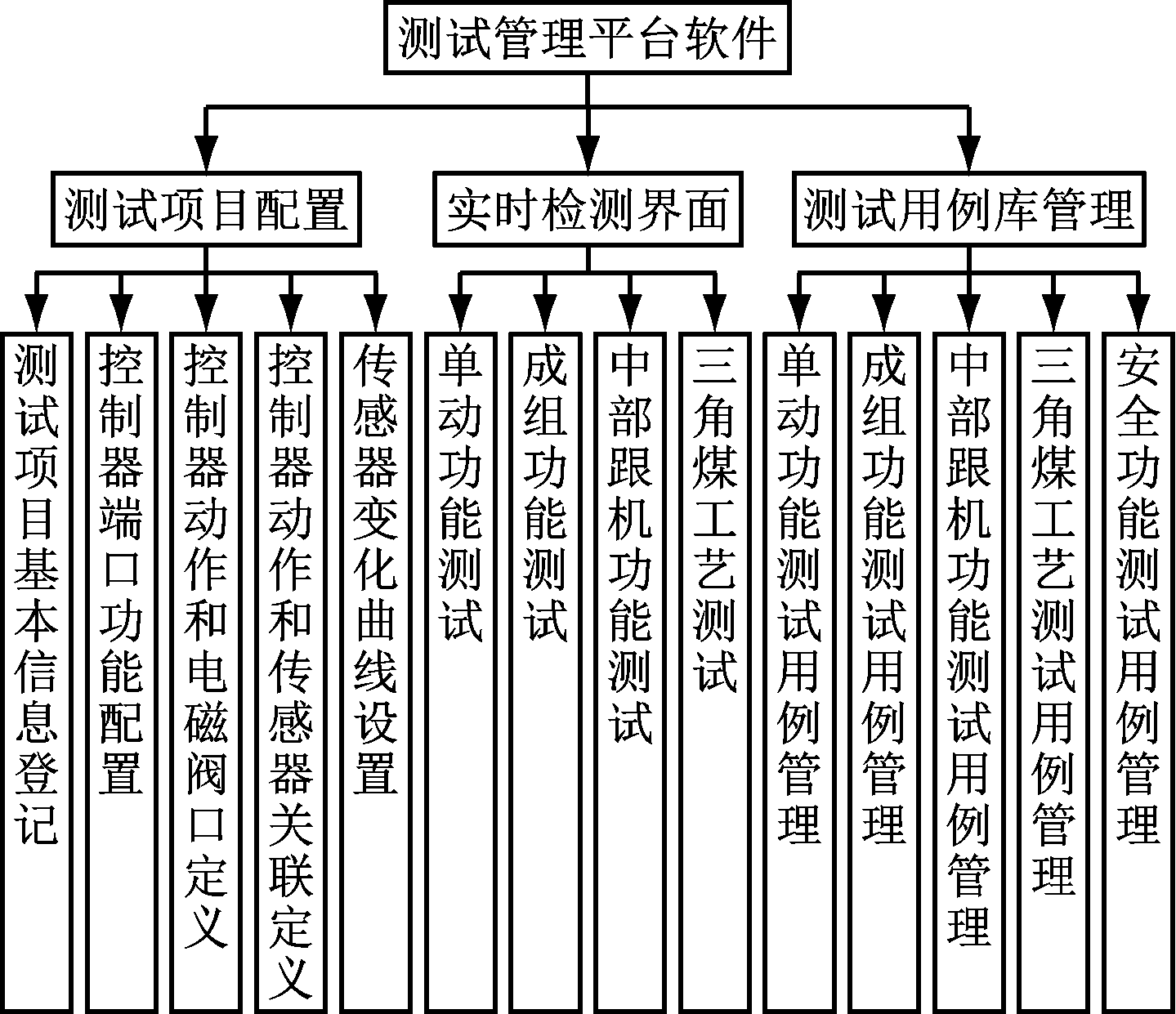 测试管理平台实现对测试用例的管理、检测装置电路端口功能的自动配置、典型工况下各种传感器数据变化过程的模拟或实际综采工作面液压支架电液控制系统运行数据的下载[9],以及检测装置检测结果的自动收集和判定,并自动出具测试报告。