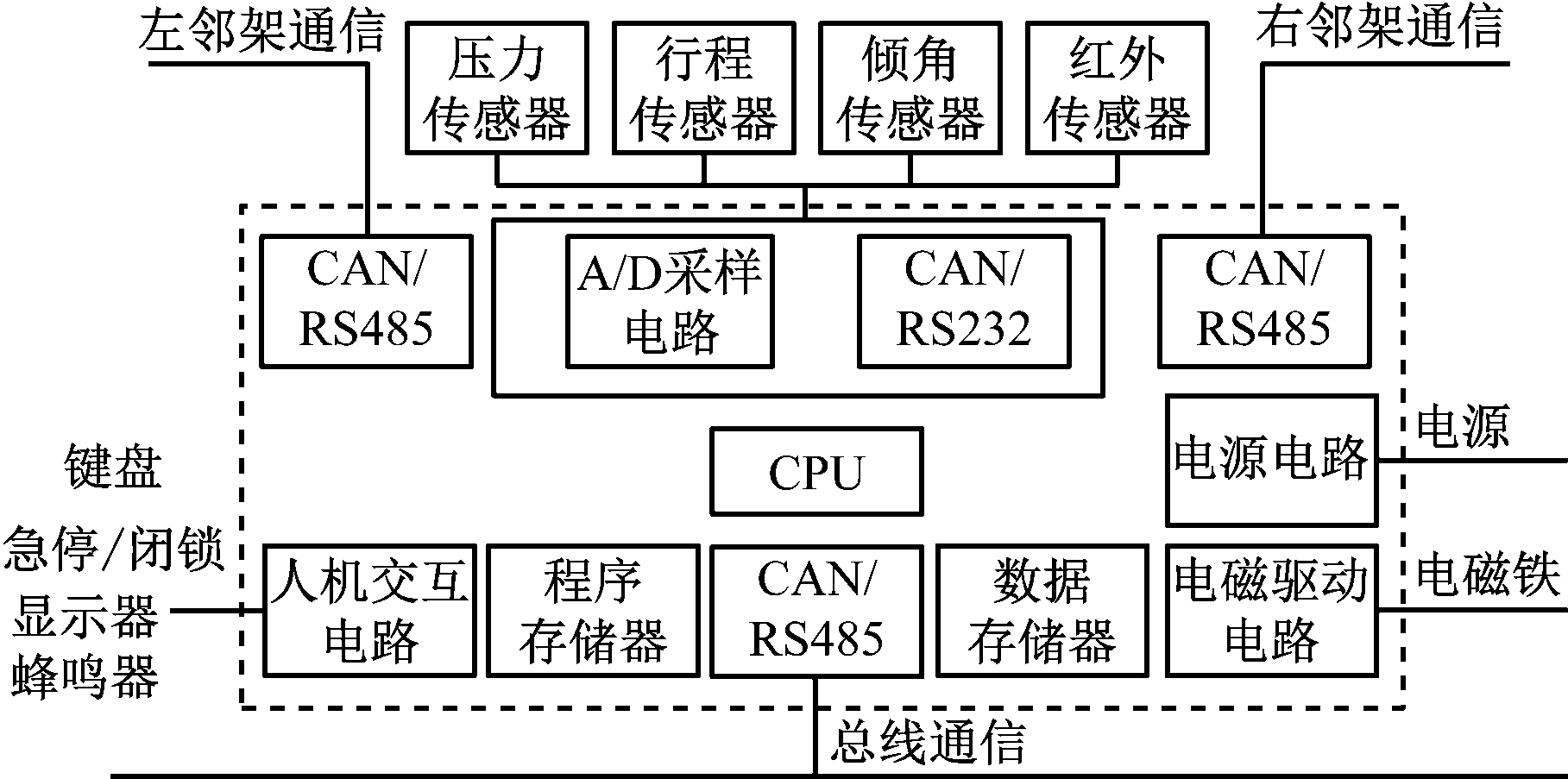 SAC型液压支架电液控制系统的核心控制部分由支架控制器、偶合器、压力传感器、行程传感器、电源箱、电磁先导阀、整体插装式多功能换向阀和连接器等组成[6-7],系统布置如图1所示,系统工作原理如图2所示。
