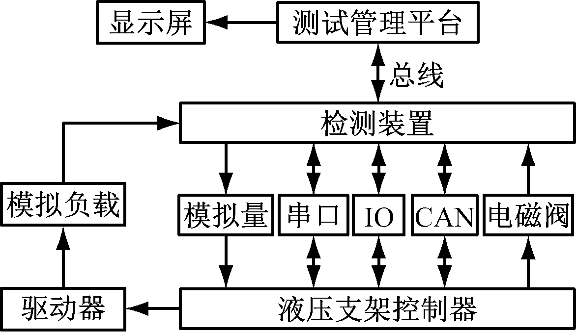 检测装置和液压支架控制器连接,根据测试管理平台的指令完成多功能传感器模拟功能的切换、控制器电磁阀口输出信号的检测,各个检测装置之间通过RS485和以太网方式互连组网。检测装置实现对传感器变化过程的数字模拟和复现,为液压支架控制器创造“真实的综采工作面数字环境”,以进行实际综采工作面运行数据的复现和系统运行工况的模拟。
